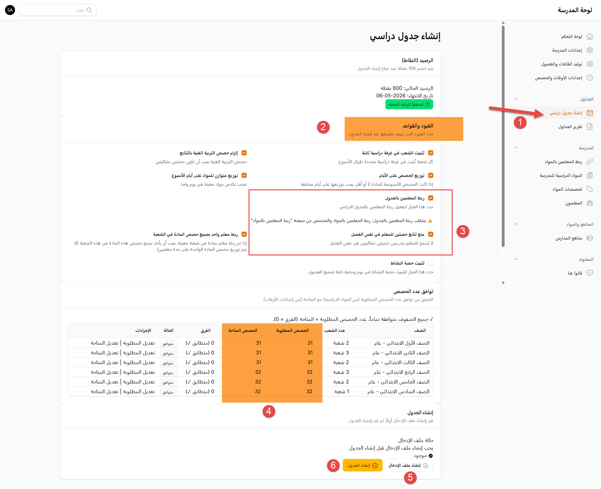 1- من لوحة تحكم مدير المدرسة اضغط على "إنشاء جدول دراسي"